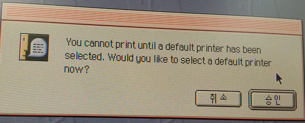 일단 위의 화면에서는 승인 버튼을 클릭하세요. 그리고 애플 메뉴 > 선택자에서 연결된 프린터가 있고, 해당 프린터의 드라이버를 설치하셨다면 해당 프린터 아이콘을 클릭하세요. 만약 연결한 프린터가 없다면, 선택자에서 LaserWriter 8이나 Adobe PS 등을 클릭하여 선택을 해주세요. 그 후에 선택자 창을 닫으면 저장 여부를 화면이 나오는데, 여기에서 저장 버튼을 클릭하세요. 이제 위의 메시지가 더 이상 나타나지 않는지 확인을 해보시기 바랍니다.